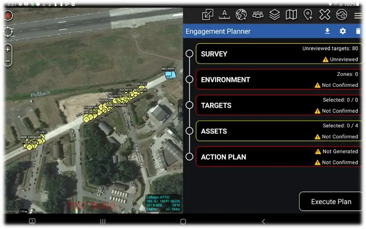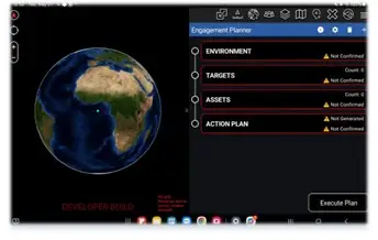 A central component of our work was the Engagement Planner, an interface that guides mission planners through the required steps to build and validate an action plan. The color‑coded task list helps users quickly identify items requiring attention—such as unreviewed, non‑confirmed, confirmed, generated, or reviewed elements—ensuring efficient and accurate workflow progression. Additional menus allow planners to define mission zones, analyze targets, and outline mitigation paths.